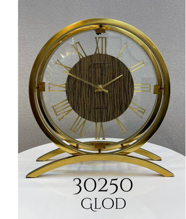 توضیحات: بدنه ساعت از جنس فلز با ابکاری فورتیک میباشد که ۱۰سال ضمانت رنگ دارا میباشد این ساعت با اعداد رومیزی طلایی روی قسمت میانی از جنس شیشه نصب شده